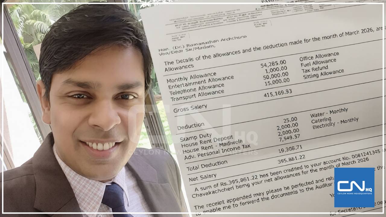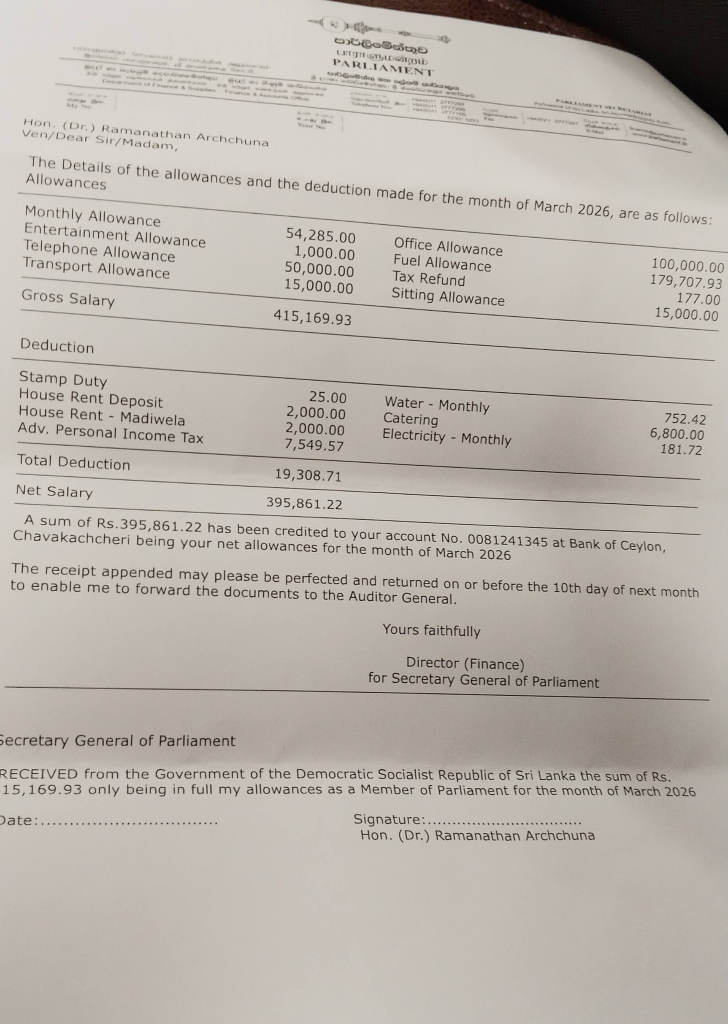 යාපනය දිස්ත්රික් පාර්ලිමේන්තු මන්ත්රී වෛද්ය රාමනාදන් අර්චුනා සිය පෞද්ගලික වැටුප් වාර්තාව ප්රසිද්ධියට පත් කිරීමට පියවර ගෙන තිබේ.