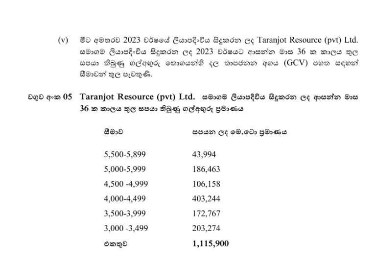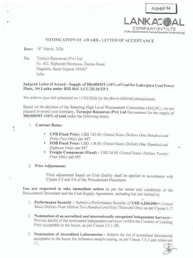 ඒ අනුව ලංකා ගල් අඟුරු සමාගම විසින් ඉතා කෙටි කාලසීමාවක් තුළ ලංසු කැඳවීම් සිදු කළ අතර, එහිදී සමාගම් කිහිපයක් ඉදිරිපත් වී තිබුණද අවසානයේදී Taranjot Resources (Pvt) Ltd සමාගම තෝරා ගැනීමට පියවර ගෙන ඇත. 2026 මාර්තු 18 වන දින මෙම සමාගමට අදාළ කොන්ත්‍රාත්තුව නිල වශයෙන් පිරිනමන ලද්දේ මෙට්‍රික් ටොන් එකක් ඇමරිකානු ඩොලර් 142 ක මිලකටය.