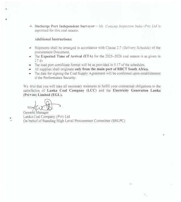 ඒ අනුව ලංකාවට එක් සැපයුම්කරුවෙකු නියමිත ප්‍රමිතියෙන් යුක්ත ගල් අගුරු සපයා නොතිබීම නිසා, විදුලි අර්බුදයක ආසන්නයට පැමිණ තිබියදීම ඒ ගැන කිසිදු සැලකිල්ලක් නොමැතිව ප්‍රමිතියෙන් යුක්ත ගල් අගුරු ආනයනය නොකරන තවත් සැපයුම්කරුවෙකුට ටෙන්ඩරයක් ලබා දීම බරපතල ගැටලුකාරී තත්වයකි.