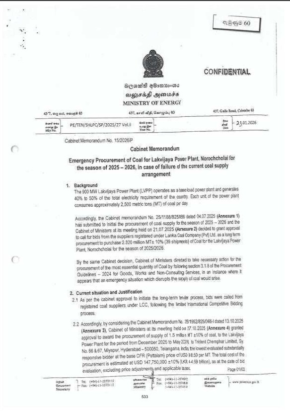 මෙම තත්ත්වය සැලකිල්ලට ගත් විදුලිබල හා බලශක්ති අමාත්‍යාංශය, සාමාන්‍ය ප්‍රසම්පාදන ක්‍රියාවලියෙන් බැහැරව හදිසි අවශ්‍යතාවයක් ලෙස සලකා ගල් අඟුරු මෙට්‍රික් ටොන් 300,000 ක් එනම් නැව්ගත කිරීම් පහක් ක්ෂණික ප්‍රසම්පාදන (Spot Tender) පදනම යටතේ ලබා ගැනීමට තීරණය කළේය. මේ සදහා කැබිනට් අනුමැතිය ලබාගෙන තිබුණේ 2026 ජනවාරි 23 දින කැබිනට් මණ්ඩලයේ අනුමැතිය හරහාය.