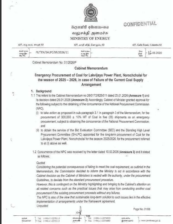 ලක්විජය බලාගාරය සඳහා 2026 වසරේදී ගල්අඟුරු මිලදී ගැනීමේ ක්‍රියාවලියට අදාළව නිකුත් කර ඇති විගණකාධිපති වාර්තාව මඟින් බරපතල මූල්‍ය අක්‍රමිකතා රැසක් අනාවරණය කර ඇත.